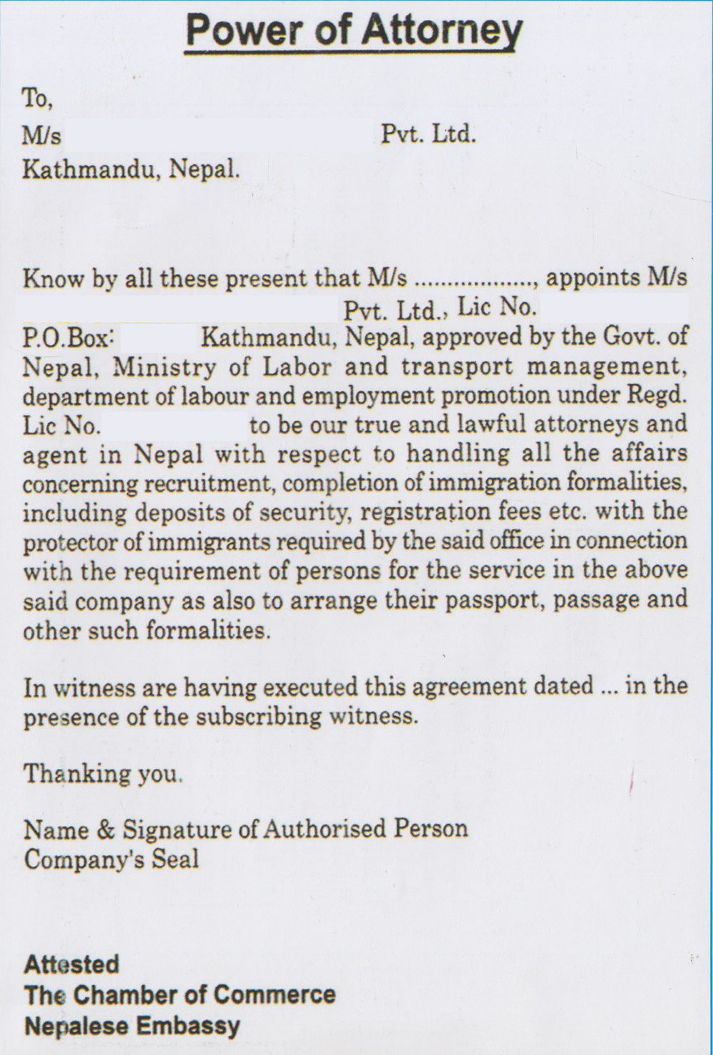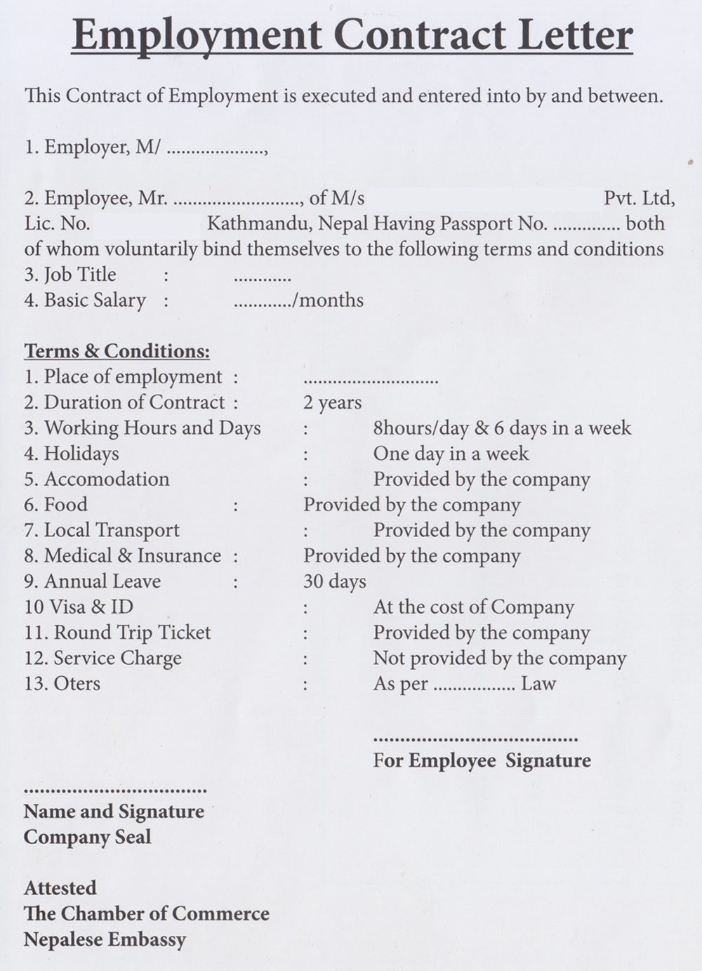 Requirements of legal documents varies country to country. Common to all are 5 legal documents as detailed below. These documents should be in Employer Company Letterhead, properly signed and stamped by company authority. These documents should get attested from Chamber of Commerce &/or Nepal Embassy of the respective country. In case of Saudi Arabia, attestation from Ministry of Foreign Affairs (MOFA ) in addition is mandatory. For Malaysia, Notery Public Attestation and Nepal Embassy Attestation is needed.