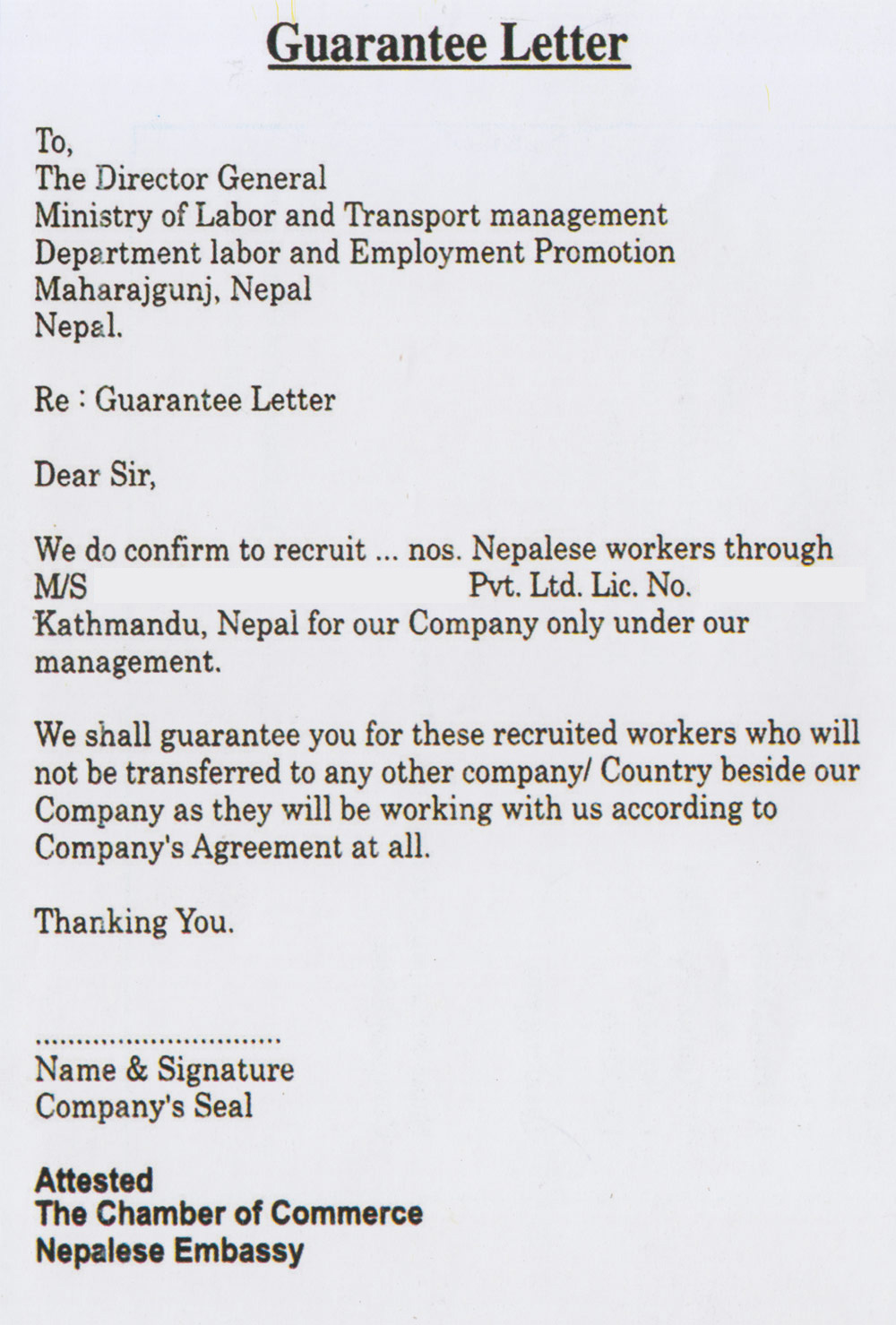 - 5. Guarantee Letter: The employing company should not transfer any workers to another country without approval of competent Nepal Government authorities.